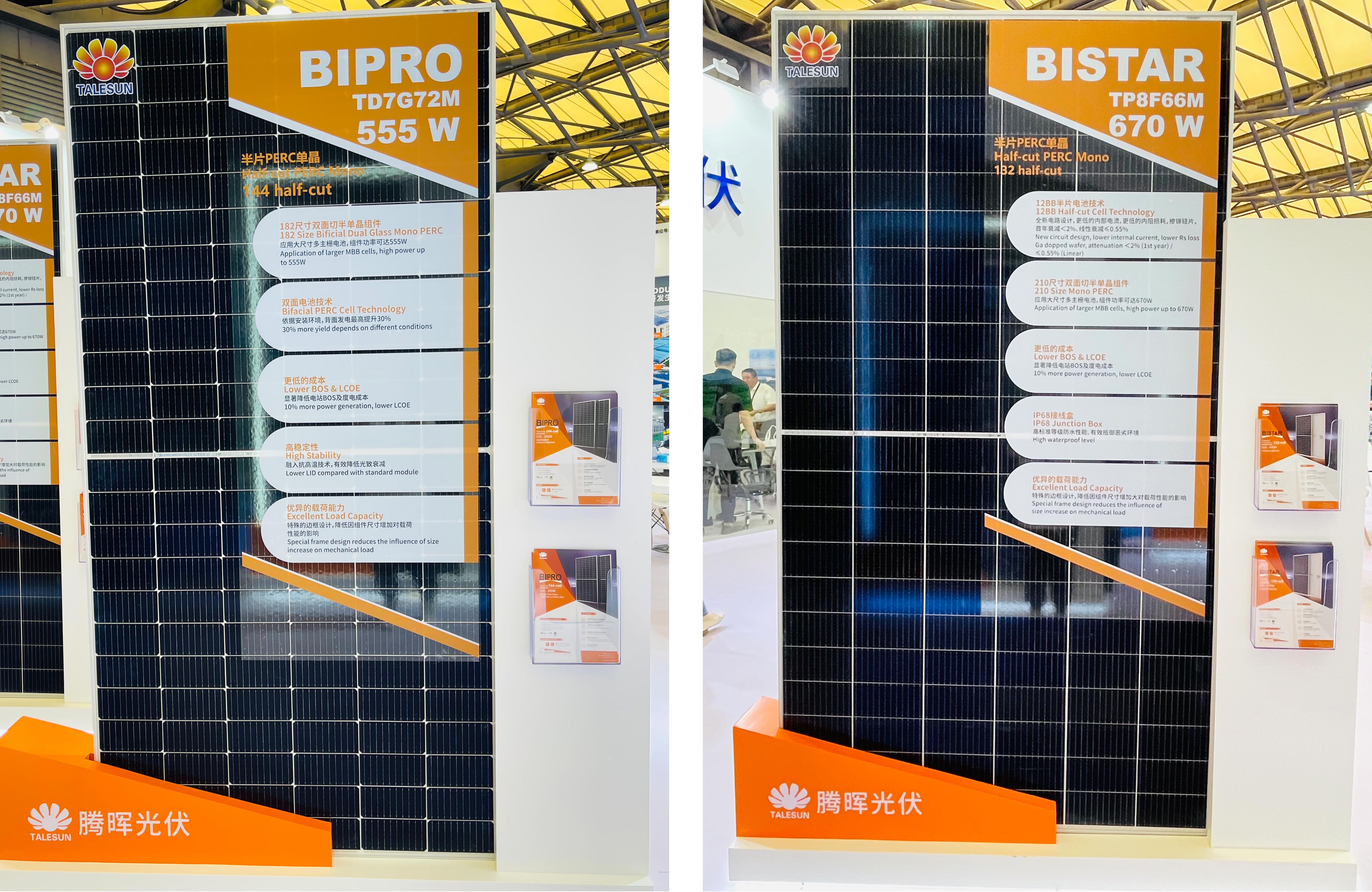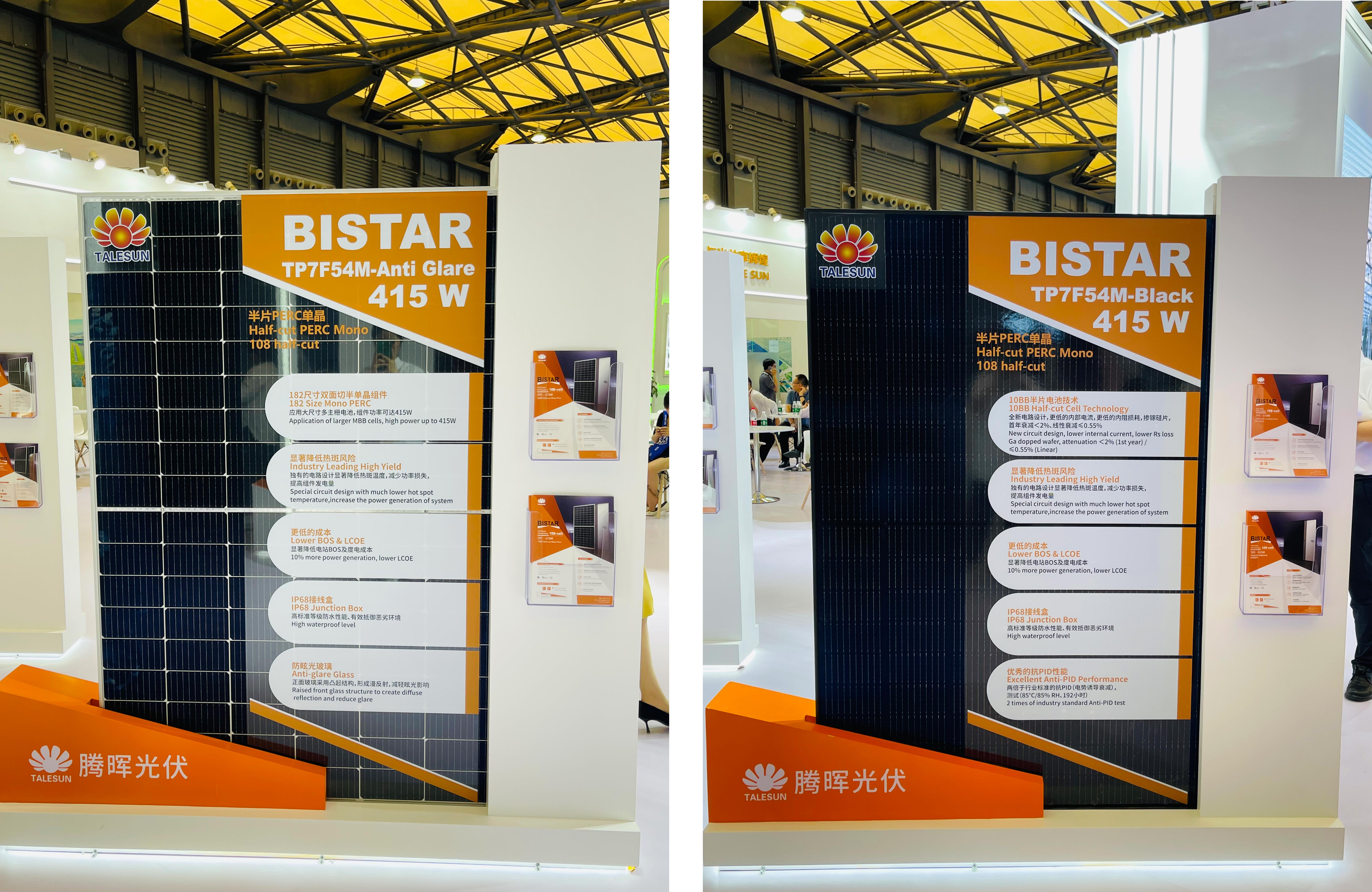 位于 E1-530 展臺的騰暉光伏,首次攜 N 型組件在國內(nèi)亮相,正式宣布進(jìn)入“N”時代。此次展出兩款組件分別為:BIPRO_TM7G72M 及 BIPRO_TM7G54M。由于 N 型組件更低的溫度系數(shù)、更高的雙面率、更低光致衰減等方面的發(fā)電性能優(yōu)勢,比起常規(guī) P 型組件來說在相同直流側(cè)容量下帶來至少 3%的發(fā)電量增益。同時,N 型組件由于更高的轉(zhuǎn)換效率,相應(yīng)降低了所吸收光能的熱轉(zhuǎn)換,從而降低了組件的工作溫度。因此,在提升發(fā)電量的同時,發(fā)電回報更高、應(yīng)用環(huán)境更廣、更受客戶青睞。